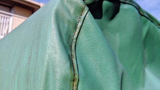 縫い目や折返しの小さな隙間から吸い上げてるっぽい。困った事になったとネットを回っていると防水塗装で雨漏りが止まったという記事をみました。確かに縫い目や折返しに水が滞留して無ければ吸い上げ難いよなーと納得。