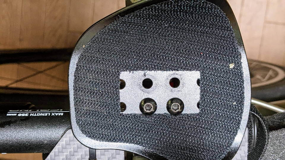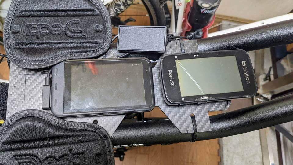 サイコン2個の段違いは見難いのとつけ外しが非常に不便だったのでカーボンプレートで自作でステーを作成しました。むっちゃ適当に作ったので結構ブサイクな形状になりました。また暇をみてもっとスマートな形状で作りたいです。