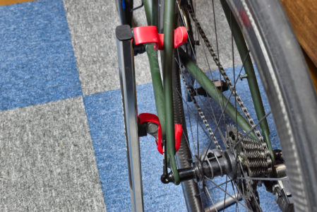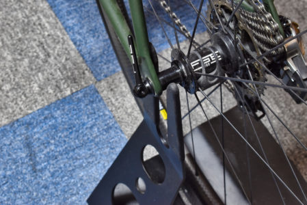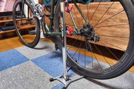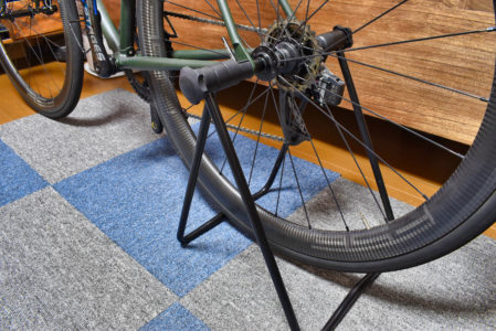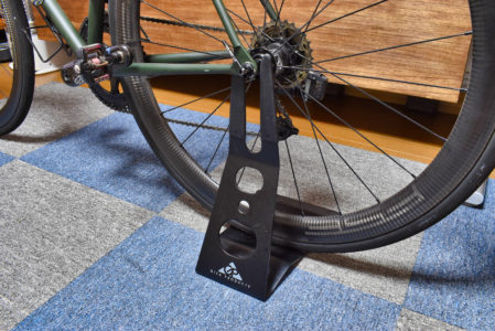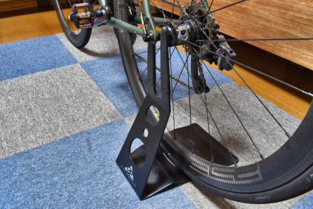 後輪ハブ軸を左右から挟み込みます。取り付けは手で開いてクイックリリースを挟むので若干面倒。安定感はかなりあります。スタンドの開き幅で高さが変えられるのでタイヤを浮かせてメンテナンス出来ます。