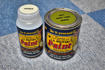 キャンディタワーのオリジナル水性塗料のアーミータンクグリーンとプライマー。つや消しのマットな感じの塗料です。塗装は手が塗料まみれで塗装中の写真を撮ってません。なので文字のみでの説明になります。