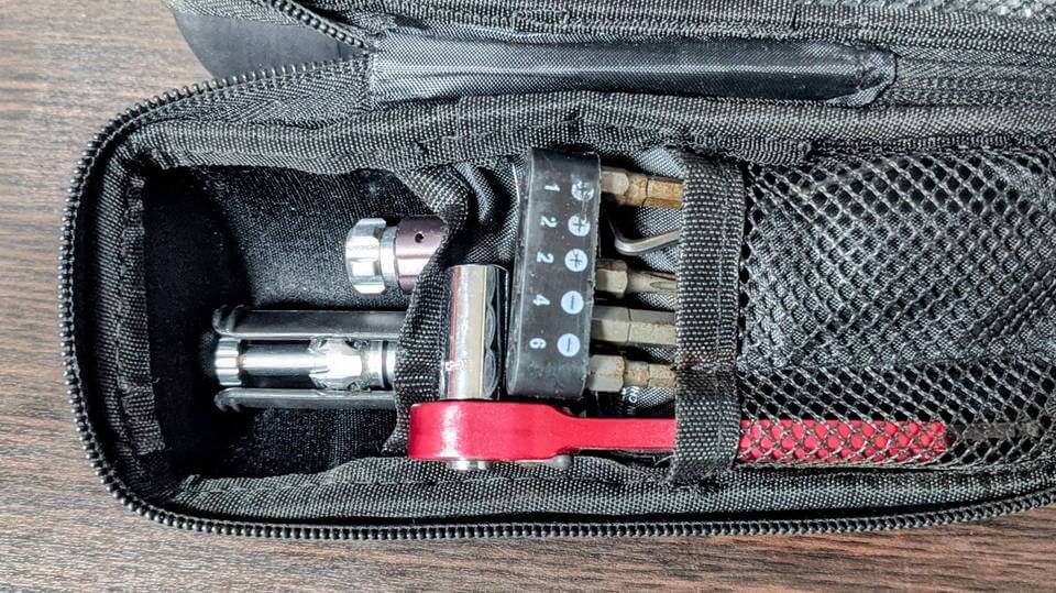 長さ15cmなのでツールケースに十分収まる長さ。エアボーンより長いが横の出っ張りも無くホースも内蔵なのでコンパクトに収まる。