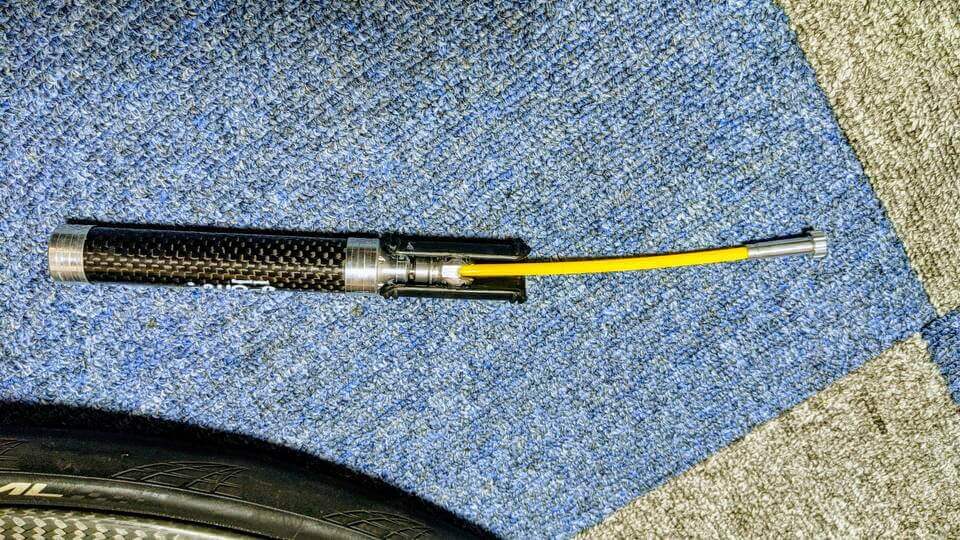 と言うのも掌の痛みを和らげるのもありますが、それ以外にこのポンプは高圧になると半端なく熱を持ちます。本体がカーボンなので胴部分での排熱が出来ず端のアルミに熱が集中している為と思われます。5barを超えたあたりから休まずポンピングし続けると端のアルミ部が持てなくなる位熱くなるので掌にはウエス等を挟んでおいた方が良いです。