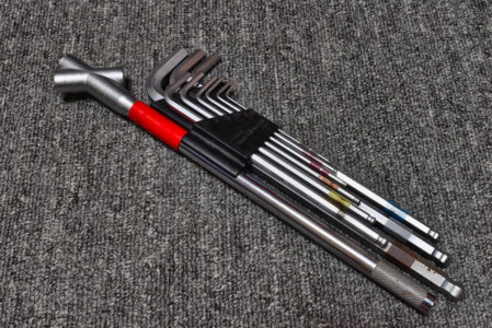 六角ボールレンチのロングタイプだと便利です。個人的には職場で使っているPBが使いやすくてオススメですがかなり高額です。僕が今使っているWISEはメッキがやや微妙な位で使いやすさはPBと同じ位良いです。ボール部でもトルク掛けて締めることもできる位強度もあります。ただホルダーが若干ゆるいです。