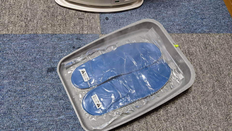 両足入れた後は足の指を少し開き気味にして6~8分程真っ直ぐに立った状態でインソールの硬化を待ちます。念の為10分程待ちました。硬化後はシューズのアーチ整形パッドは剥がします。接着力が強く剥がすのに結構難儀しました。