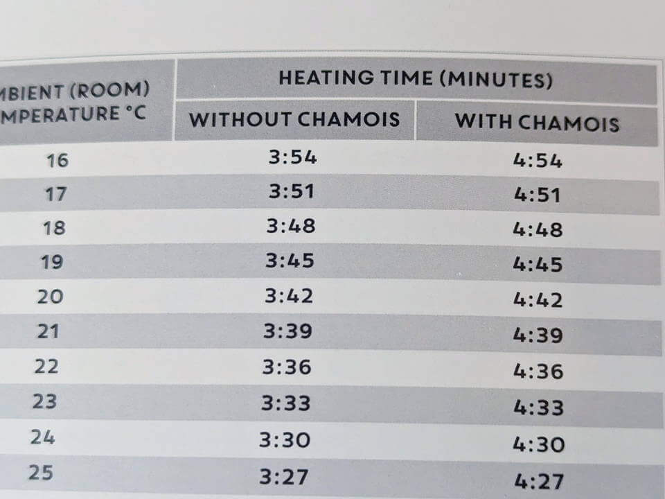 説明書に従ってヒーターで温める時間を決める。気温18度でwith chamoisはレーパンの事だろうと適当に推測しレーパン履いてキッチンタイマーを4:48にセット。