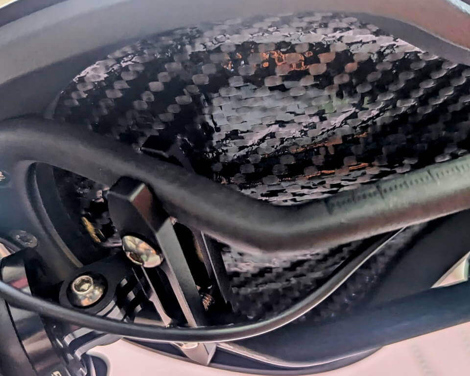 サドルはカーボンのベースに最大で1cm厚位のウレタンクッションが乗っている感じ。表皮類は無くそのままウレタンクッションで質感はあまり良くない、高級感無しw