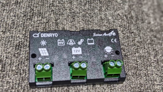 このままソーラーチャージャーをバッテリーに繋げてしまえば作業終了で良いのですが後々適当なパネル買って自作とか簡単にしたいとか色々の事を考えて今回はチャージコントローラーを購入。安心の国内メーカー電菱の消費電力の少ないモデルで今回にはもってこいのコントローラーです。今回用意したのはコレだけです。