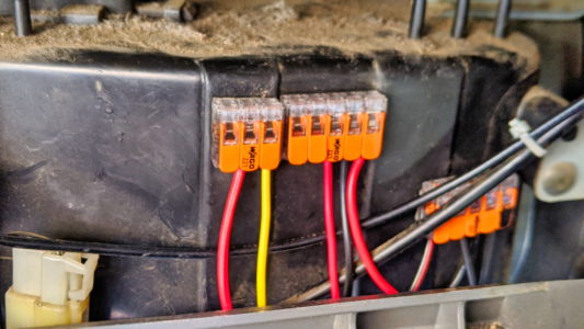以前は配線の接続は端子台とキボシでしていましたが最近は専らワゴコネクターを使っています。配線の被覆剥いて挿してロックするだけでOK。カシメも半田も要らなくて接続、分岐が出来るので超便利。これマジおすすめです。