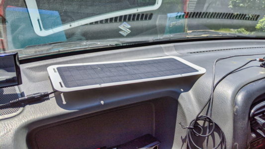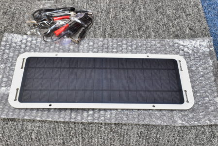 ソーラーパネルは12V5Wの物を用意しました。中華パネルなのでスペック通り出ているのか多少心配でしたが晴天下で約240mAとまずまず合格かな程度には出てました。フレキシブルなんで耐熱、耐久性は分かりません。
