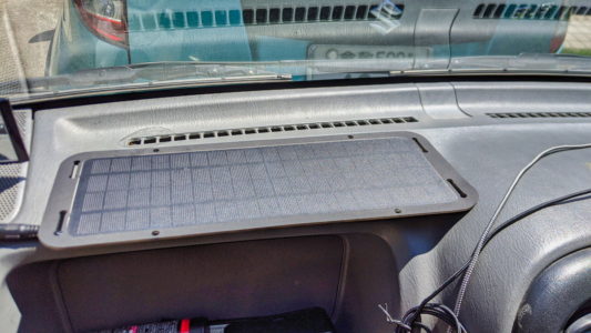 電流を測定したところ車内だと100mA程度でした。フロントガラス挟むとそれ位まで落ちても仕方ないですねぇ。