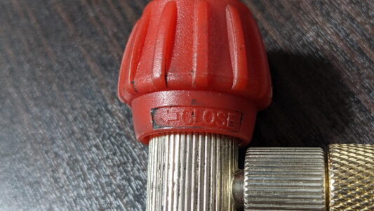 使い方はまず最初にバルブが閉まっているかを確認。開けたままボンベ挿すと一瞬でエアー無くなって終了になるので注意。