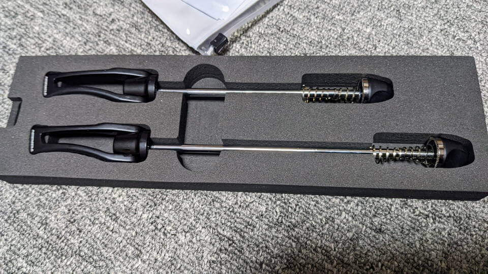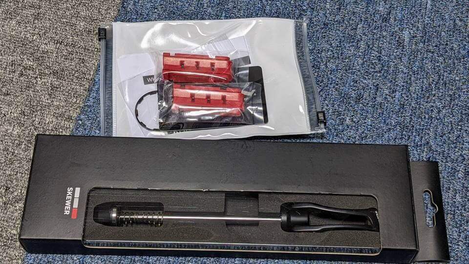 付属品はクイックシャフトとブレーキシューに10s用?と思われるスペーサー。ホイールバッグ等は付属しておらず。
