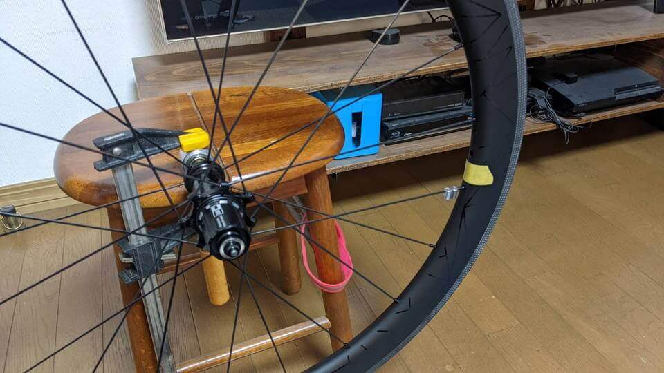 チューブレスホイールだけどニップルホールは空いているのでガッチリとチューブレステープが巻いてあります。