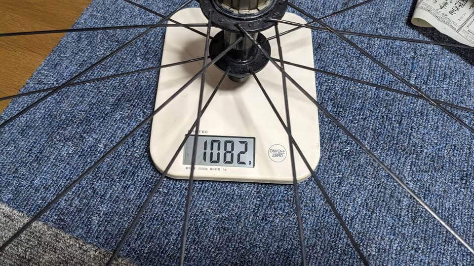チューブ、タイヤを取り付けた重量を以前使っていたFSEのホイールと比較してみます。バランスウェイトをフロント2g、リア3g貼ってます。