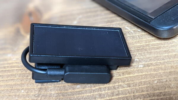 内容は本体、充電ケーブル、フロントマウントアーム、ソーラーパネル。マウントはガーミンと同じなのはポイント高い。