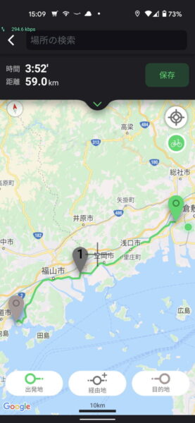 どんな感じなのかローカルな場所の話になりますが先日のライドで実際に走った道で紹介します。倉敷から尾道を目的地としてルートを作成し、違いが分かりやすかった倉敷から笠岡までの間を比較します。