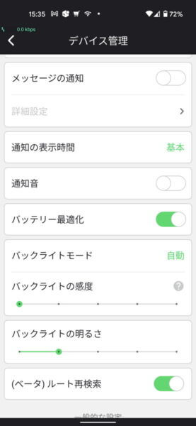 通知、バックライトの明るさ、感度設定等。感度は最弱でも相当反応良いです。