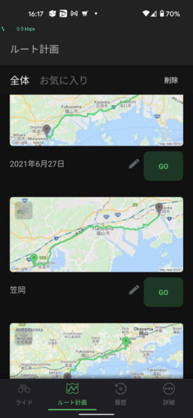 ナビをしたいルートの『GO』を押せばナビを開始します。