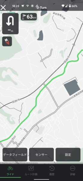 ナビ時のマップ表示倍率は3段階まで。マップの表示は「道幅の判別不可」とツイッターで呟いたが拡大表示だと判別出来るのに後から気付いた。ずっと最大縮小表示してたので気がつかなったです(汗)。ナビ時は速度表示の横に何メートルでどの方向に曲がるのかのルート案内が表示されるので分りやすい。ルート案内はマップ表示以外のデーターフィールドでも表示されるのは有り難いです。