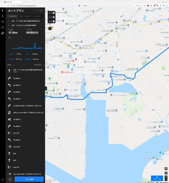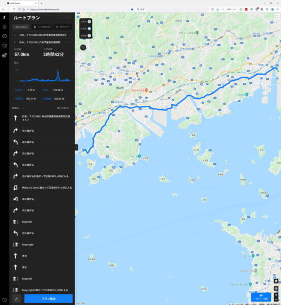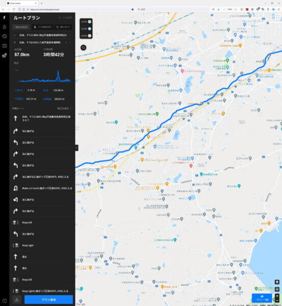 PCブラウザからもルート作成出来ます。ブラウザからだとスマホでは表示されなかった高度も表示します。