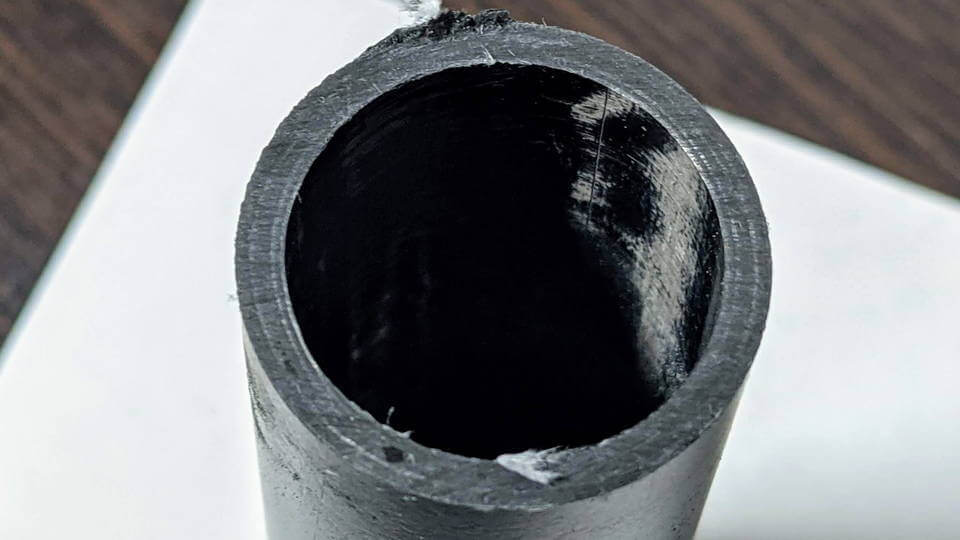 カーボンの密度が高くてカットするのにかなりの時間を要しました。今まで切ってきたカーボンとはカット面の密度が全然違いました。カットしたパイプを叩くとキンキンと金属っぽい音がします。