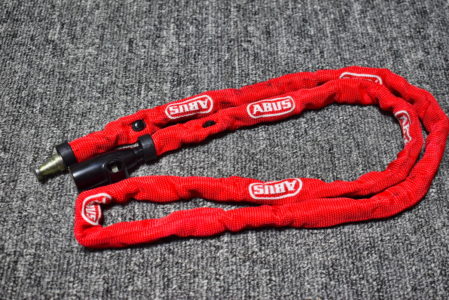 超定番ブランドabusのチェーンロック錠1500です。チェーンロックなのでワイヤーに比べれば頑丈でワイヤーカッターやニッパーでは切断出来ずソコソコ安心感は高いです。セキュリティレベル3。